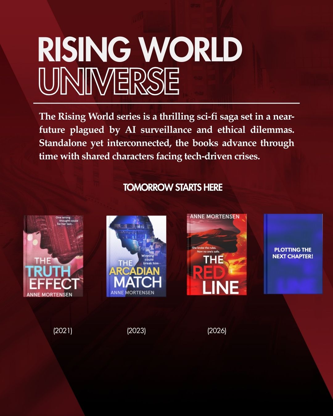Each book, The Truth Effect (Book 1), The Arcadian Match (Book 2), and The Red Line (Book 3 coming in Feb 2026), throws a brand-new protagonist and crew into the fire: a rogue coder in London, a secret service tech librarian in Sweden, a quantum PR reputation trader in Stockholm, a black-market drone dealer in Libya, a regime rebel in Chad, or just a wise mentor desperately clinging to the last scraps of unedited humanity in London.